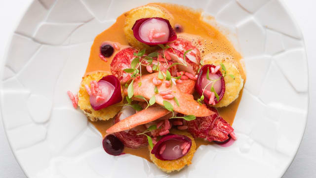 - Pickles de betteraves, gel litchi, palets de riz, bisque de homard corsée