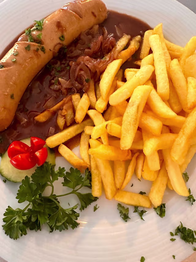 - Kalbsbratwurst an zwiebelsauce mit pommes frites