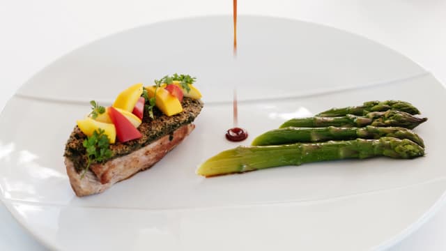- Filet de turbot rôti, purée de panais et chips de jambon cru