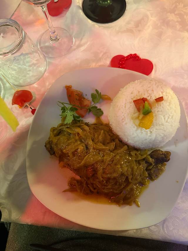 - Cuisse de poulet mijoté aux oignons, olive et citron. Servi avec riz blanc