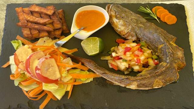 Poulet braisé aux saveurs du burkina. Garniture au choix: allocos, riz blanc, attiéke frite, chikwangue
