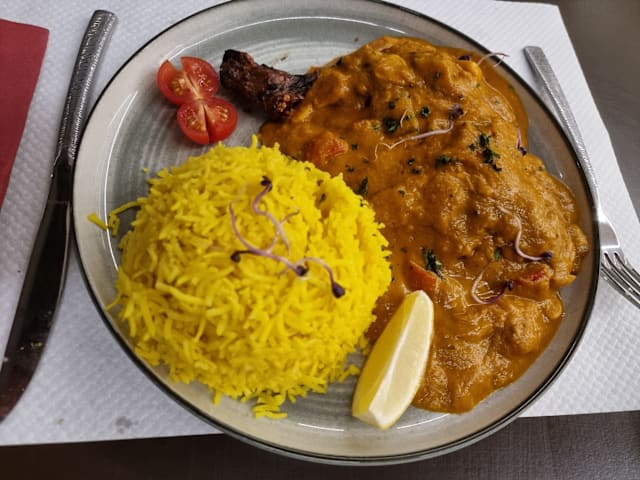 - Agneau avec épinards, sauce piment doux base kourma. Servi avec riz basmati