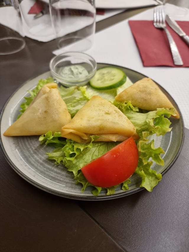 - Triangles farcis de pommes de terre, petits pois et carottes, assaisonnées d'épices indiennes