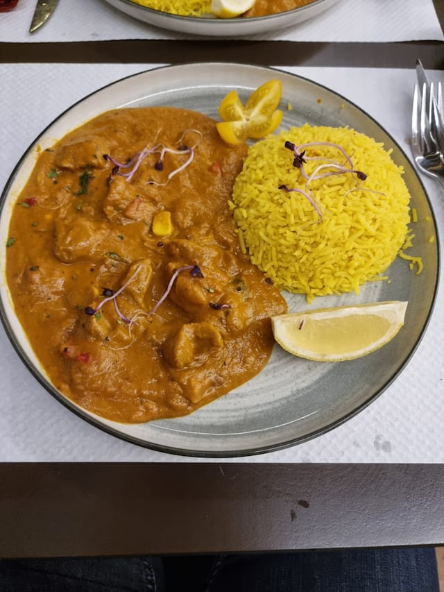 - Poulet avec épinarde, sauce piment doux base kourma. Servi avec riz basmati