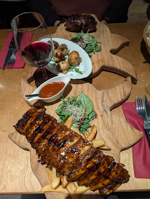 7.5/10The steak here was outstanding — perfectly cooked, tender, and full of flavor. The ribs were equally impressive, juicy with a great smoky taste. The ambiance really elevated the meal, with warm lighting and a cozy, stylish vibe that made it a great place to unwind. That said, the service could use improvement. During our visit, the restaurant seemed understaffed, with one person handling everything. While he was friendly and doing his best, the wait times were noticeably longer than ideal. Overall, a great spot for quality meat and atmosphere, but service may vary depending on staffing.