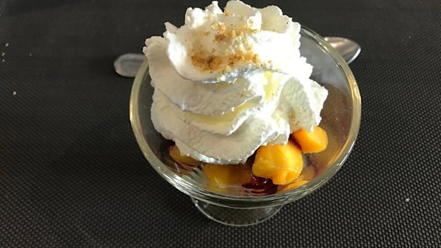 Soupe de mangue accompagnée d'une mousse au chocolat