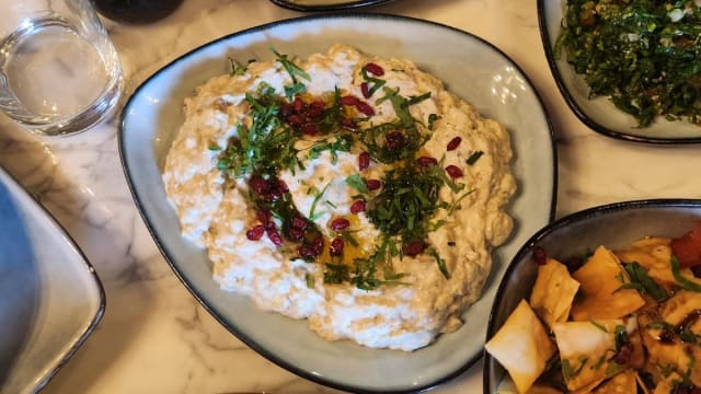 Purée de pois chiches et crème de sésame, viande d’agneau (ras asfour) accompagnées de cornichons et un pain maison.