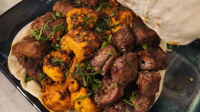 Poulet fermier, sumac, oignons, pignons et pain shrak.