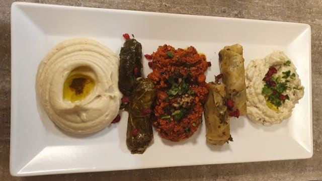 3 variétés de rissoles (fromage, viande hachée de bœuf, épinard) kebbeh à la viande hachée de bœuf, houmous, moutabal, tabouleh, feuilles de vignes et un pain maison.