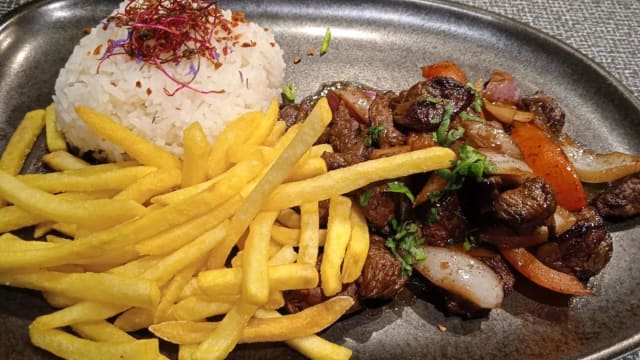 Le plat emblématique péruvien composé de boeuf sauté avec des tomates, des poivrons, des oignons et une sauce soja, le tout accompagné de riz et de frites