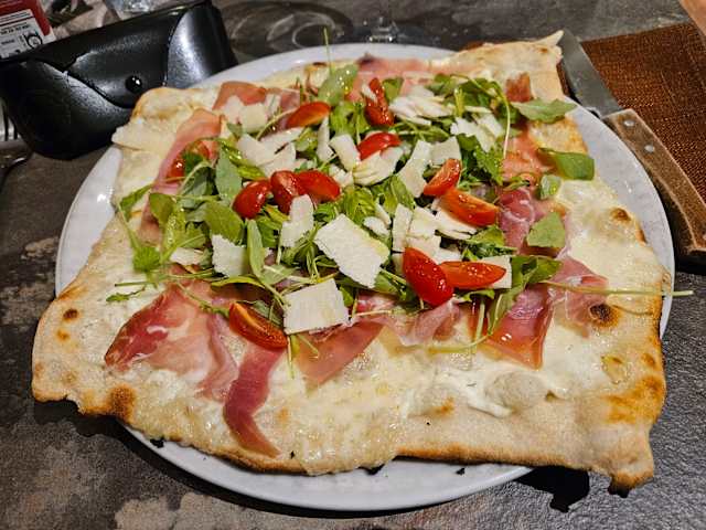 - Crème fraîche, mozzarella 100% fiore di latte, jambon de parme (36 mois), roquette, parmesan (24 mois), tomates cerises
