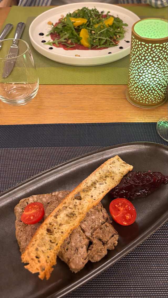 - (magret de canard, œuf poché, marrons, figues, pommes gala, croûtons et vinaigrette au miel)
