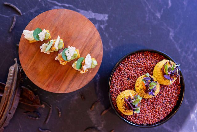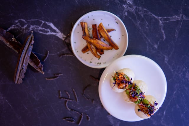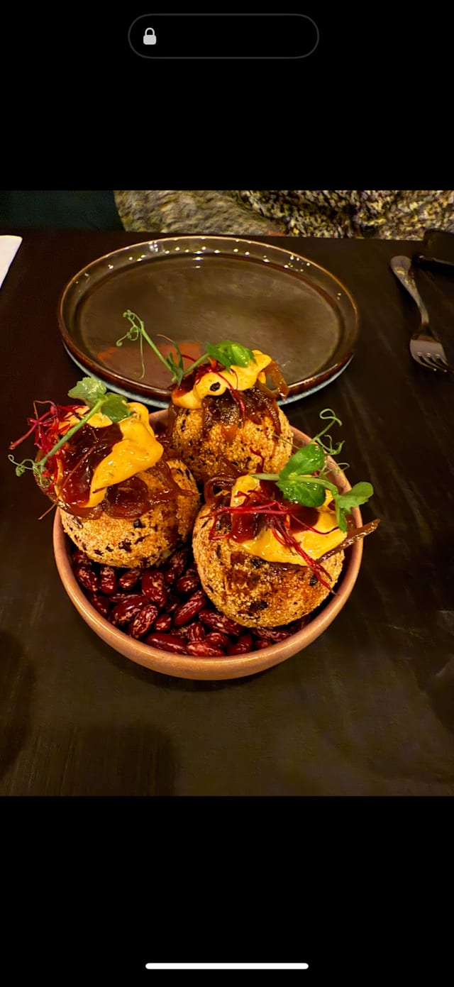 Mashed sweet potatoes turned into croquettes, coated in crispy gari (fermented cassava flakes), topped with a scotch bonnet chutney and a smoky tatashe emulsion. Finished with caramelized onions a comforting, fiery, and textured bite from the chef’s west African roots.