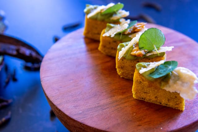 - Mashed sweet potatoes turned into croquettes, coated in crispy gari (fermented cassava flakes), topped with a scotch bonnet chutney and a smoky tatashe emulsion. Finished with caramelized onions a comforting, fiery, and textured bite from the chef’s west African roots.