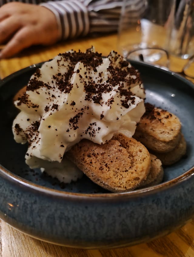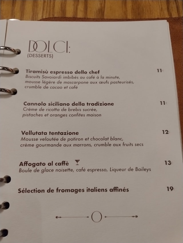 8/10We arrived on a stormy wintry mix night and the tables are very closely packed in this small restaurant. Even though we were the second table there - the order came slowly and surprisingly I think they did not spend time to make it properly. My pasta was al dente but lacked sauce - but did come with sardines and walnuts and raisins. So the flavors were good but a little more sauce would have been appreciated. My partner's pizza focaccia bread was undercooked so it was not crispy or even browned on the bottom. I saw them put it in the oven from my seat and it was in there for 2 minutes max. So perhaps 2 more minutes would have been perfect - personally I like the pizza crust to be crispy. It was soggy. The truffle toppings were very copious and they get the 8 points for the generous topping but no more. He actually wanted to give them 7.7. So close enough. We were so unimpressed with the dinner we did not order dessert and left. But incidentally the kir was 11 euro.
