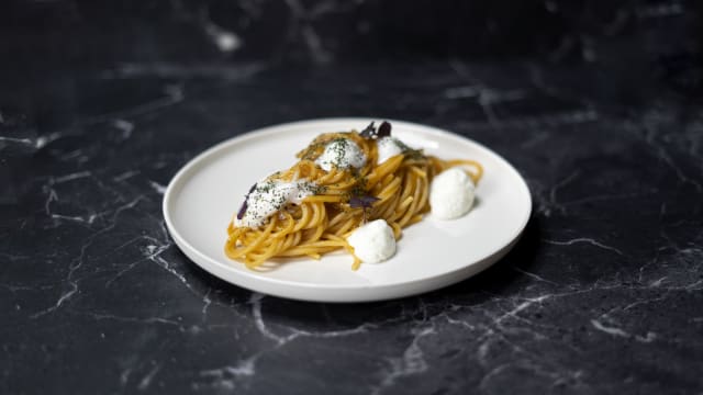 - Pâtes fraîches, bisque de langoustines, carpaccio de langoustines, gel de citron vert, poudre de langoustines