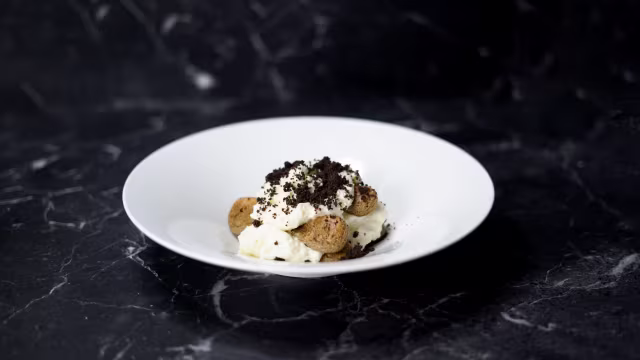 - Biscuits savoiardi imbibés au café à la minute, mousse légère de mascarpone aux œufs pasteurisés, crumble de cacao et café