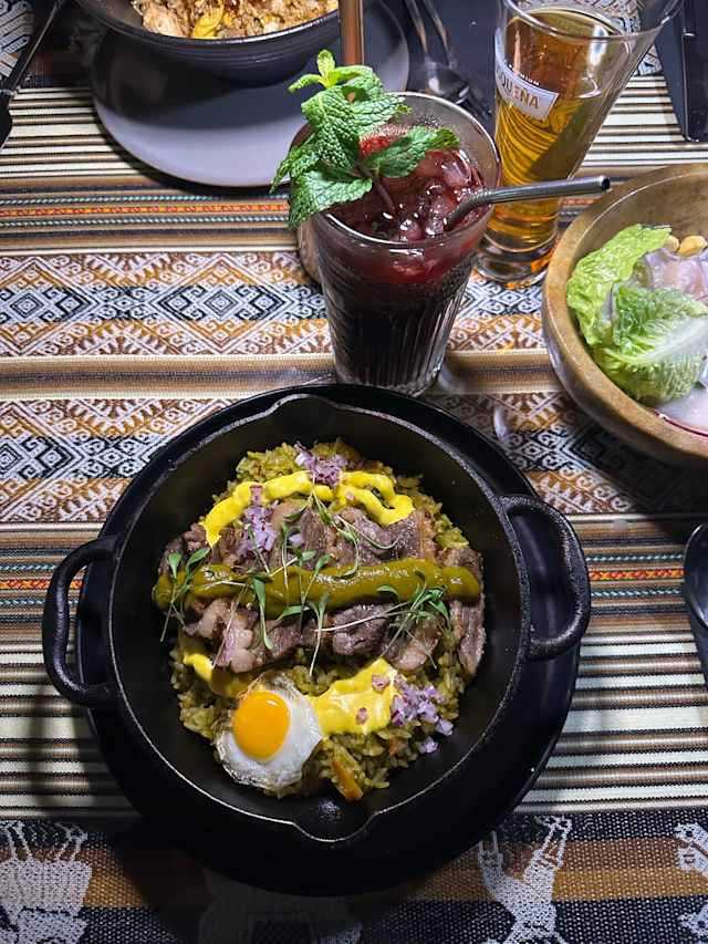 - Cordero lechal macerado en chicha de jora, aderezado con cilantro y ají amarillo, acompañado con frijoles, yuca y arroz