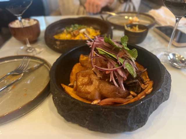 - Tentáculos de pulpo marinados en salsa anticuchera servidos sobre majado de yuca coronado con chimichurri ahumado de huacatay.