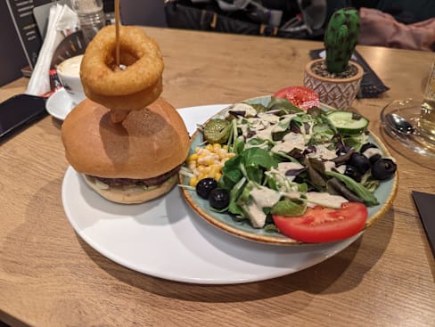 10/10An awesome burger, a great salad, very nice service and with 30% discount a great deal. Highly recommended!