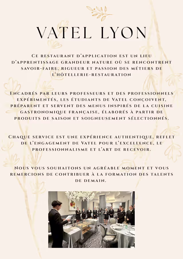 Restaurant Vatel - LyonDear Sir, We are delighted that you enjoyed your experience at our establishment! We hope to see you soon. Students of the Vatel application restaurant