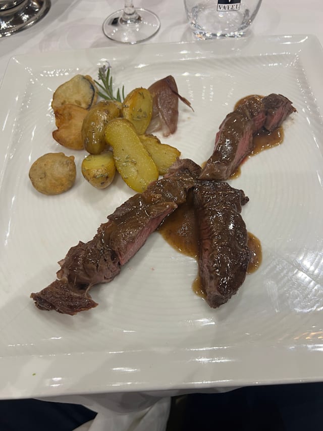 Côte de boeuf flambée à votre table, pommes grenailles au romarin et jus corsé à la tapenade, échalotes et beignets d’aubergine (pour 2 personnes)