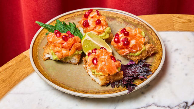 Duo de tartare thon et saumon, feuille de shiso-wasabi