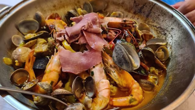 - Tomate fresco, queijo, camarão, lulas, mexilhão e delícias do mar