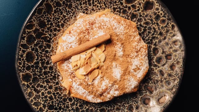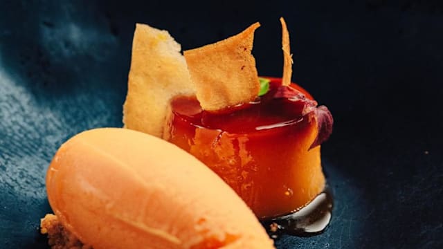 Pudim abade de priscos com telha de canela e sorbet de tangerina