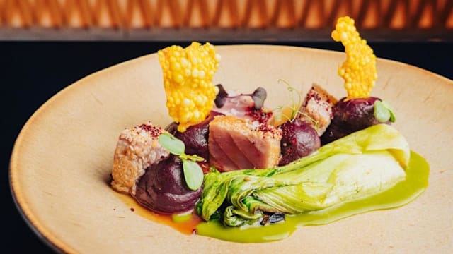 Escabeche de atum, bimis grelhados com shimenji e tapioca crocante de curcuma