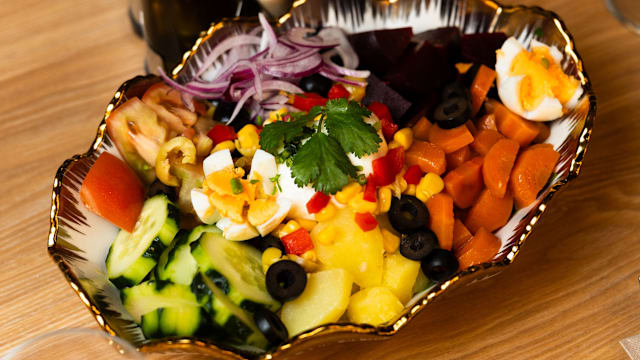 Maiz. pepino, lechuga, tomate, patatas cocidas, aceitunas y huevo duro