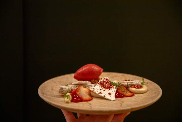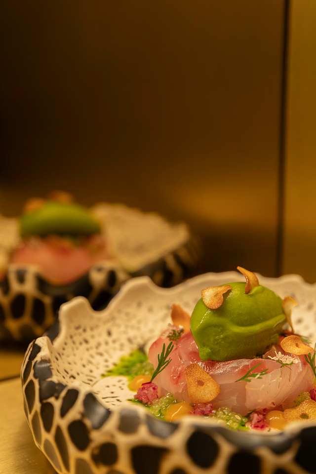 - Palmier de batata recheado com tártaro de novilho e gelado de koji de avelã