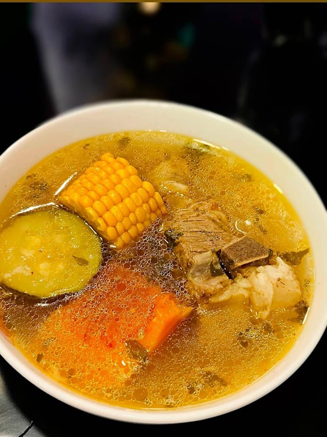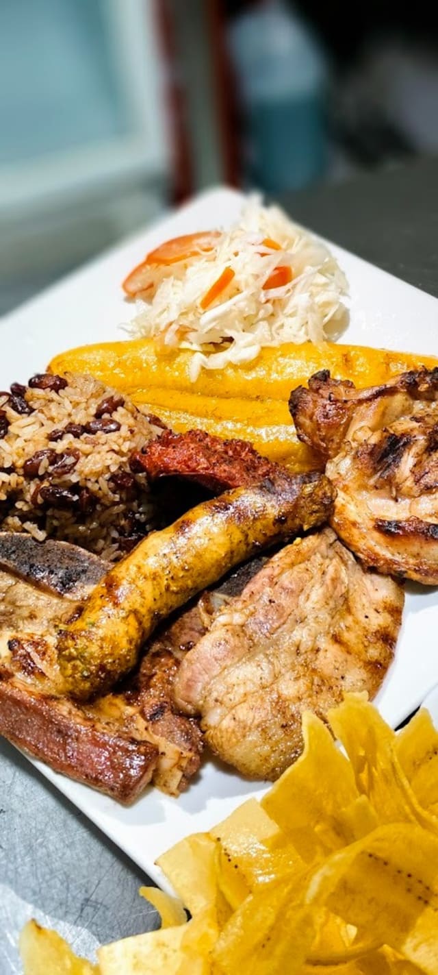 Con ternera, pollo, cerdo y chorizo picante a elegir gallopinto o tajada