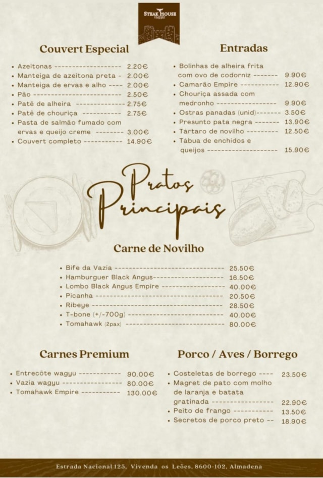 10/10The food, the service and the general ambience were top notch. I highly recommend this restaurant. In our party we had beef, lamb and fish dishes and all were delicious - prepared and presented with care. Empire Steak House is a must go to when you are in the Algarve.