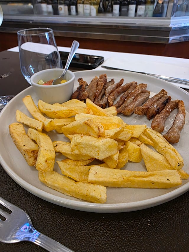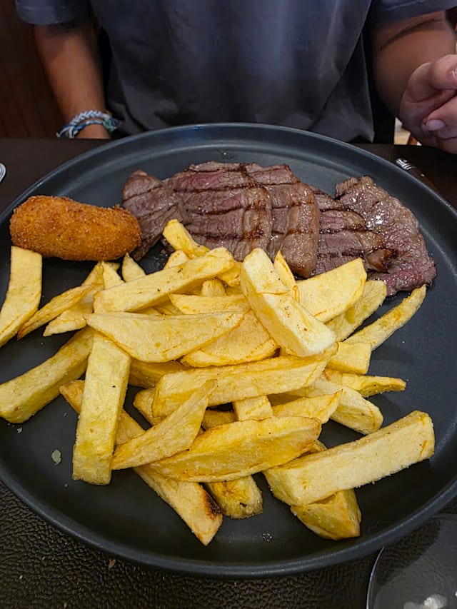 Bife do coração de alcatra com ovo a cavalo, arroz e batata frita