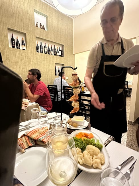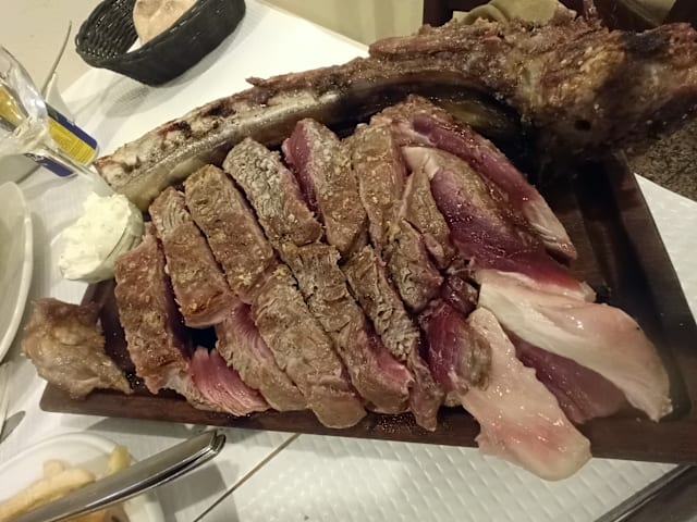 8.5/10We were found a seat in the heart of the restaurant where we could see the coming and goings of the staff. Our server, although new, was very good and attentive through out the evening. The Manager was very helpful and the chef kept bobbing in and out between the ovens and the grill with great humour. We both had steaks that were cooked to perfection and a nice bottle of Douro Reserva.