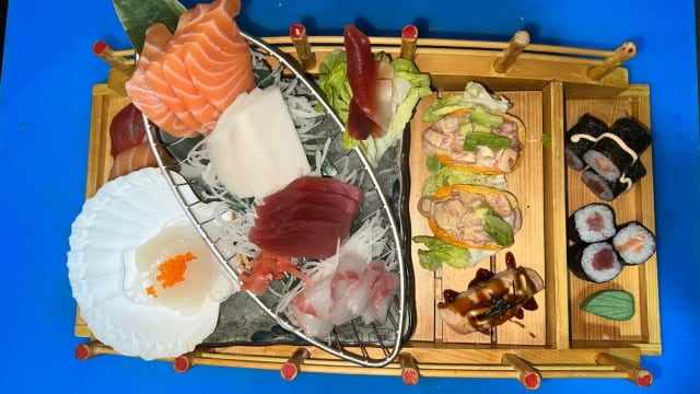 Sushi mixto presentado en barco De madera con 22 piezas de niguiri y maki