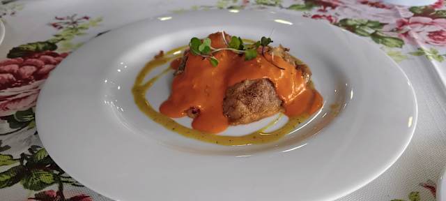 - Bacalao confitado con piperada y salmorejo al martini rojо