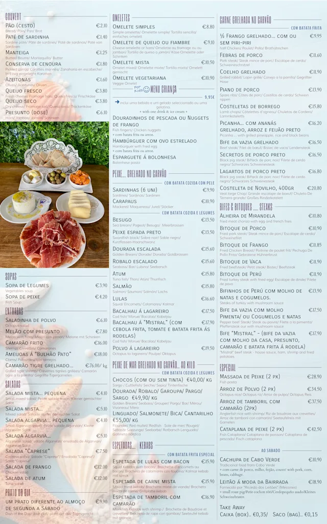 The food came out at very different times. My daughter had finished her pizza before we had even been served. The monkfish kebab was cold and the fish was dry, the wedges were very dry. Husband’s steak was good and meal was warm. Waiters didn’t communicate well and they forgot the water for the table but still tried to charge us for it. Disappointing for our last meal in the Algarve and wouldn’t return in a hurry.