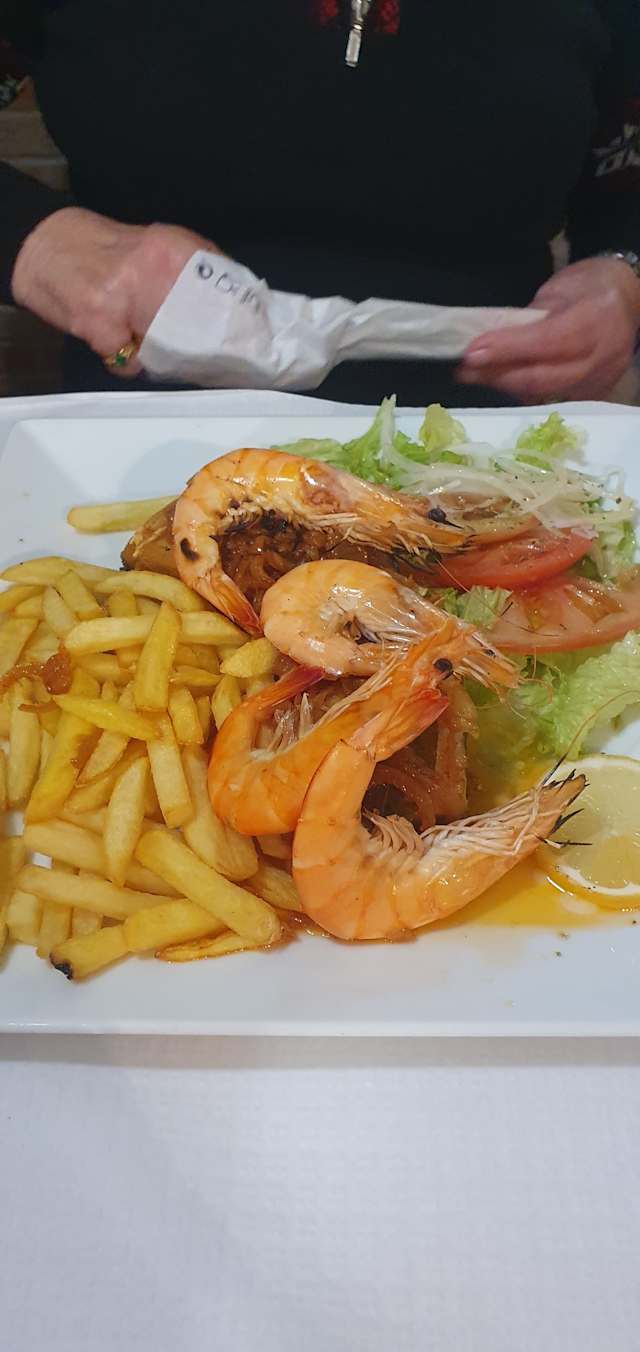 - Mista especial de carne, peixe, camarões e salsicha servido de salada algarvia, arroz, feijão e fritas