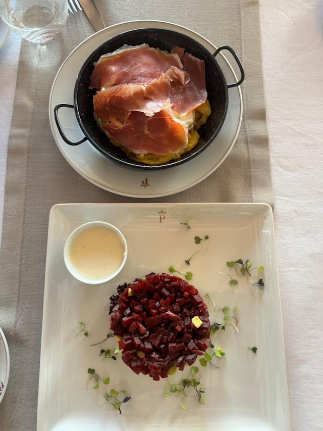 Service was sub-par. We choose not to order from the fix choice menu. We ordered just a few items from the menu but we were charged the full menu price. The waiter did not guide us through the fix choice menu and so we had no idea we'd still be charged even though we had significantly fewer selections. Part of the reason we choose to order a la carte was that the menu was limited. The food when delivered was not fresh--the seafood pasta had canned shrimp, the veal steak was almost all fat, the potatoes were soggy and the for the ensalada mista, we were charged 24 euros. We were terribly disappointed. This was by far the worst meal during our two week travels in Spain. The management was unapologetic. Needless to say, we did not dine there again during our several day stay in Arcos de la Frontera.