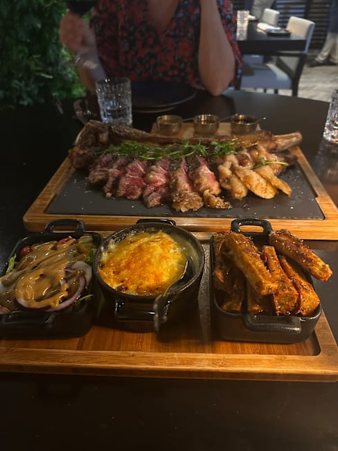 6/10Overall on ‘ok’ experience. Team was present, a badge on the uniform gives you a heads up on what is going to happen. Service not hospitality. Greetings at the door was warm but it was the only one. Junior team more caring but senior team quite sharp and ‘on a mission’. Unfortunately even the basic of service have been left behind. Food was just ok having a look at the price. A medium rare steak should deliver a good amount of juice but this wasn’t the case. The dessert was suppose to have a theatrical part attached to it but the show was really poor. One sharing steak (1kg) with sides, 1 glass of wine and 2 x 0%abv beers, water! 1 fish fingers and ice cream for my daughter. Nearly €200. I expect a bit more.