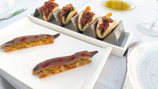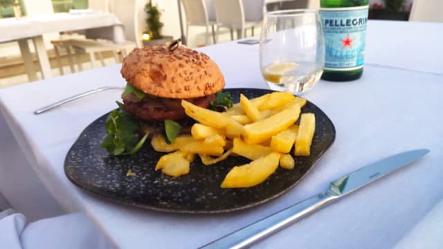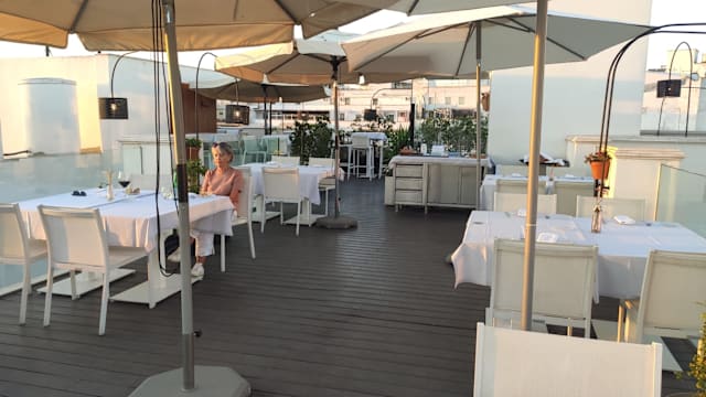 8/10Hidden gem tucked away on roof of a hotel with spectacular views. Food area however is a little cramped and when we arrived we were initially asked to squeeze ourselves into a tight space between another large group table and a partition. Five minutes in we all realised that was not going to work so things were rearranged but I did wonder given occupancy of tables being low whether different arrangements might work better for all. Food was good and service prompt in general but wine was too warm initially although some time in an ice bucket took care of that. Excellent veggie burger and great Seville torrijo dessert which was enough for two of us. It was raining so we didn’t linger on the terrace although there didn’t seem to be a bar area set up, although we may have missed it as no one was sitting outside due to weather.