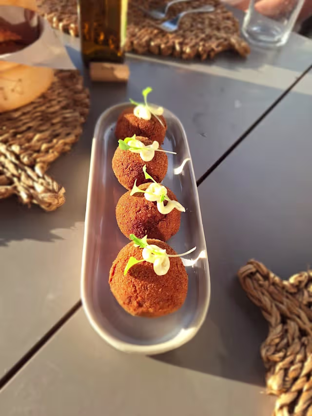 - Croquetes de 12 variedades de carnes tradicionais do cozido, maionese de couve portuguesa.