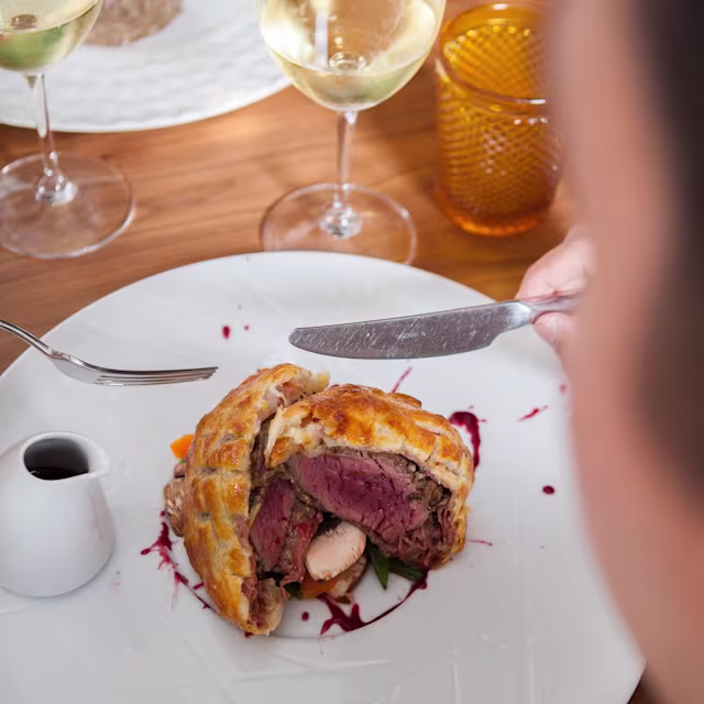 - Bife wellington, arroz três bagos e esparregado