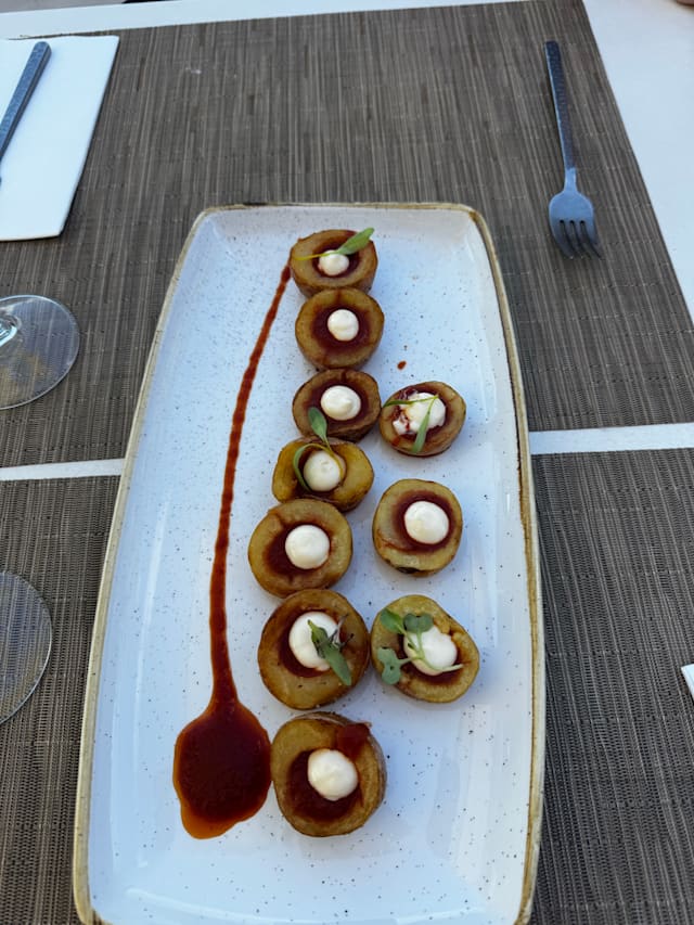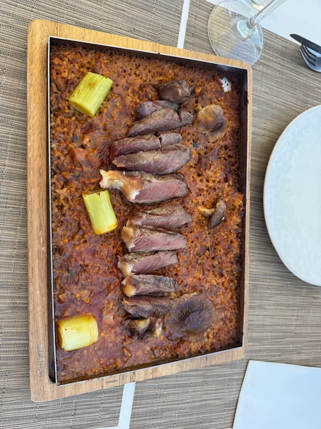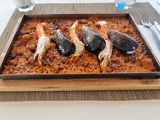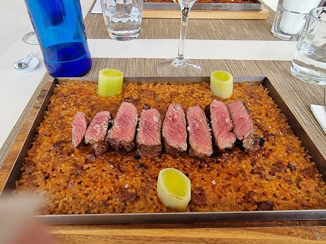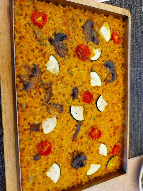 8/10I dined here to take advantage of using yums. The ambience and setting is definitely the main reason for coming, great views of sitges, the mountains and the sea. Service was also friendly and welcoming. I'm vegan so there were a few options for eating. The starter, grilled leeks, was very nicely presented and had lots of good flavours. The vegan rice, however, is a bit of a disappointment, especially when they say "you will not miss the meat". A few thin slices of mushroom and courgette, plus some cherry tomatoes, on a thin bed of rice is not much of a substitute. I saw meat and fish eaters dishes going out and this did not compare. I think they need a vegan chef to help them out with this.