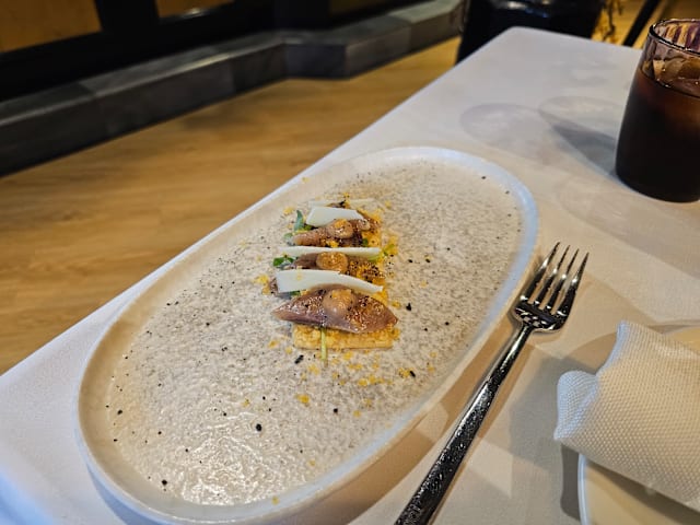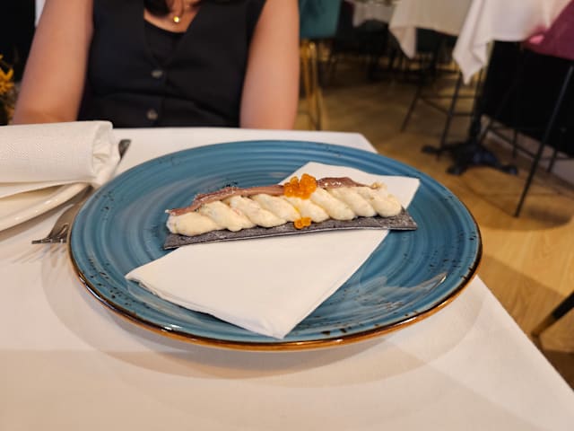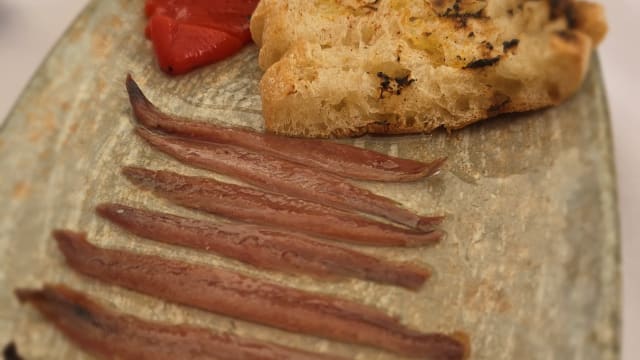 Tomate asado, bonito en salazón, crujiente de bacalao.