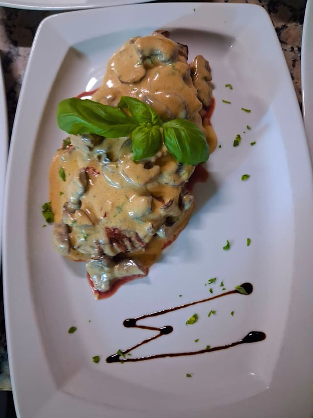 - Bife de vaca do lombo gratinado com molho de cogumelos