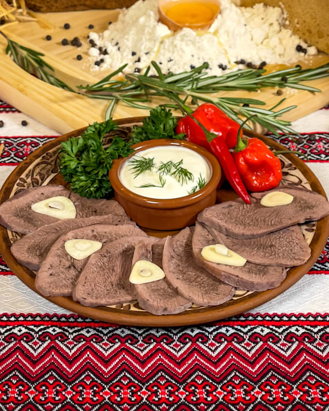 Finas láminas de pollo en gelatina, una delicadeza ucraniana que destaca por su frescura y sabor auténtico.