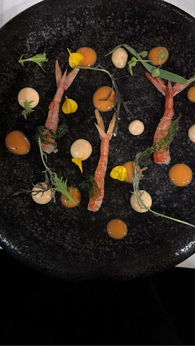 - Gamberi rossi crudi, caramello di gamberi, pane croccante, aglio nero, maggiorana